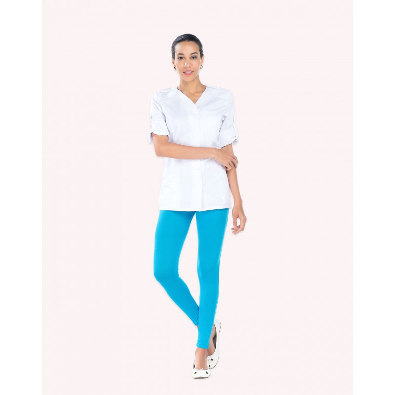 Tunique femme, manches longues transformables, coupe ajustée, fermeture par pressions, 2 poches basses, 2 poches BIP, 1 poche poitrine passepoilée, 2 fentes dos, longueur 70 cm