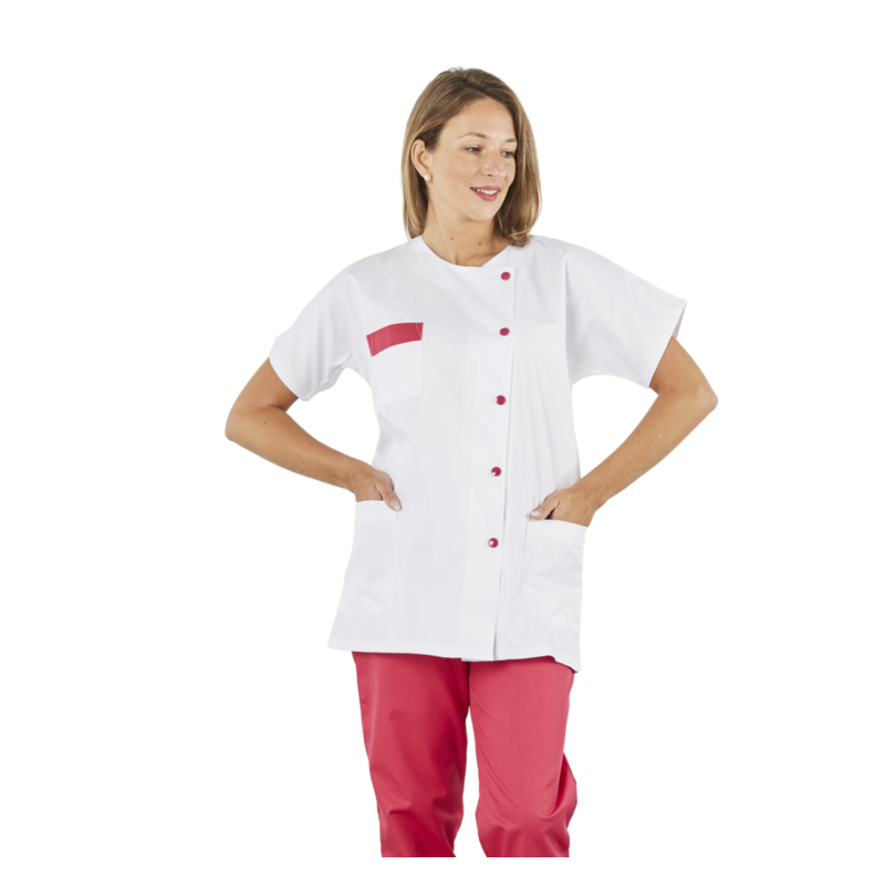 Caractéristiques : Col rond, manches kimono, 2 poches plaquées, fente côté, fermeture par 5 pressions calottées, parement poche poitrine hauteur milieu dos 75 cm